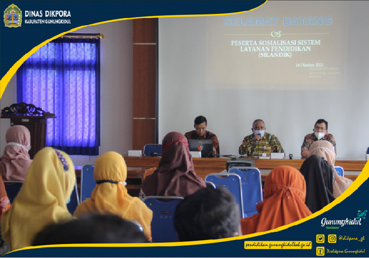WONOSARI- Dinas Pendidikan, Pemuda, dan Olahraga (Disdikpora) Kabupaten Gunungkidul bersama Badan Perencanaan Pembangunan Daerah (Bappeda) Kabupaten Gunungkidul menyelenggarakan kegiatan Sosialisasi Sistem Informasi Layanan Pendidikan (Silandik) tahun 2021. Bertempat di Ruang Rapat Handayani Disdikpora kegiatan dihadiri langsung oleh Sumiyat, S.Pd., M.M.Pd. selaku pemateri dari  Bappeda dan Tijan, S.Sos., M.M. Selaku Kepala Bidang Sekolah Menegah Pertama Disdikpora Kabupaten Gunungkidul.